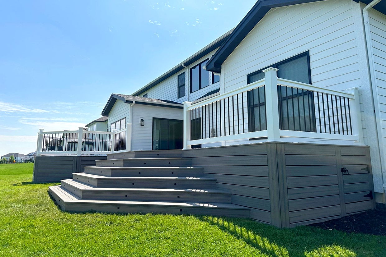 The railing system, matching the exterior of the house, adds to the home’s curb appeal. A distinctive feature of this deck is the cascading staircase with integrated lighting within the steps. These lights not only enhance safety by illuminating the pathway at night but also add a sophisticated visual appeal, making the staircase a focal point even after sunset. The lighting elements are subtly embedded, which highlights the architectural details without overwhelming the design.